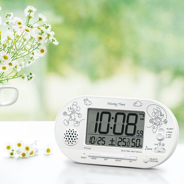 温湿度表示とカレンダーで更に便利にミッキーとミニーが一筆書きで描かれた大人可愛いデジタルクロック