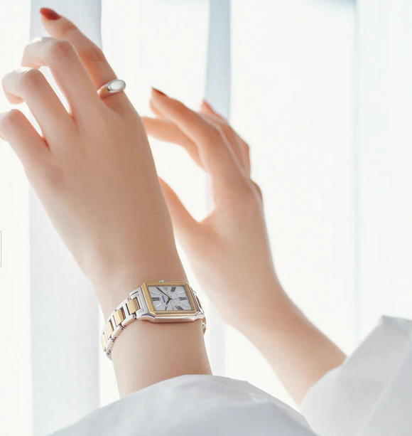 ・バランスの良い長角フォルムは堅苦しくなりすぎず、ワークシーンのジャケットスタイルから、オフのワンピーススタイルまで幅広いシーンで活躍する万能ウオッチです。