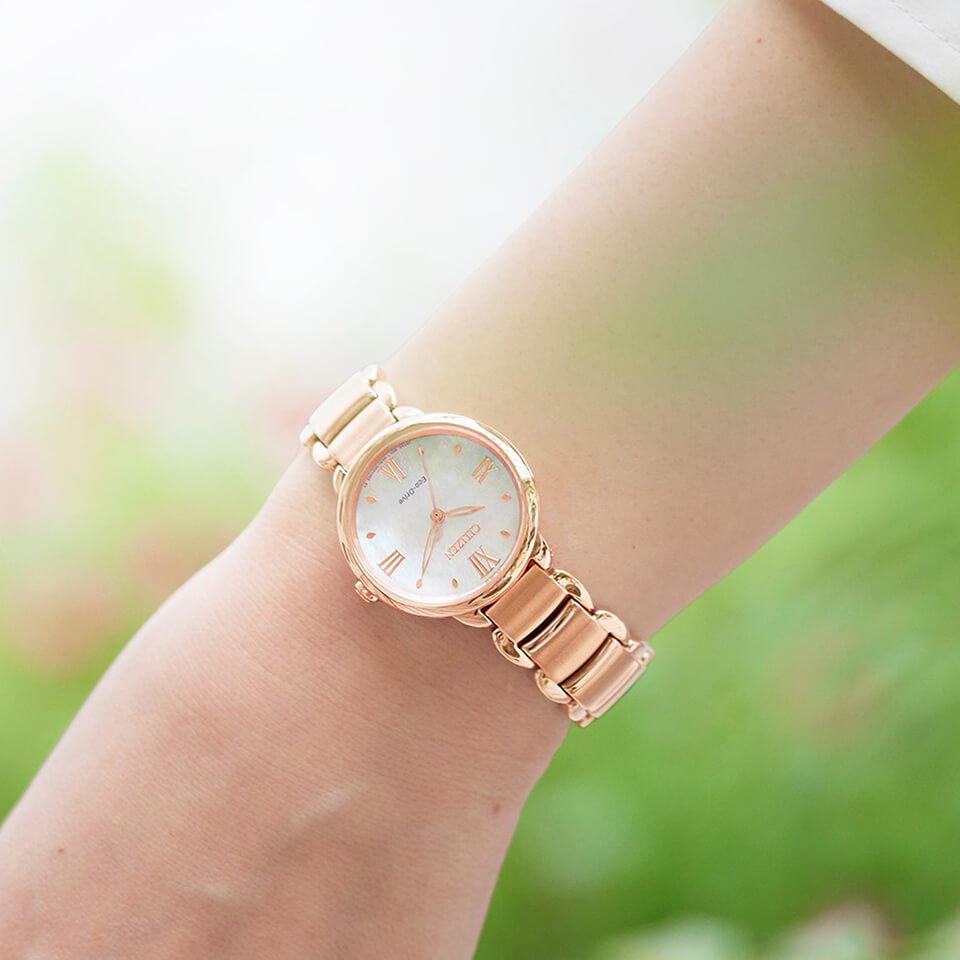 光発電『エコ・ドライブ』は、太陽光や室内のわずかな光を電気に換え、時計を動かしつづけるシチズン独自の技術です。一度フル充電すれば、光のないところでも長時間動き続けるので、定期的な電池交換は必要ありません。