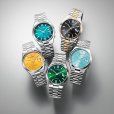 ・スポーティなケース形状と腕なじみの良い3列バンドで付け心地の良さにもこだわり、カレンダー部分には視認性を高める拡大鏡レンズを採用しました。