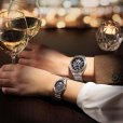 ・月が輝く夜空を思わせるダークブルーの文字板。インデックスには飛びローマ数字を採用し、レディスモデルには6ポイントのダイヤモンドをセッティングしています。