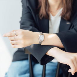 ・1、5、7、11時位置に中央からはじけるような形状のインデックスを配置し、軽やかさを演出しています。