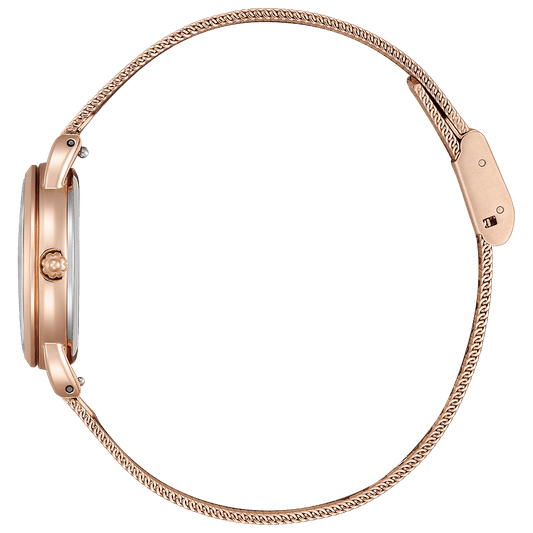 ・12時の位置には2ポイントのクリスタルガラス、2時と8時位置のインデックスには雪のきらめきを表現したさりげない装飾をプラス。