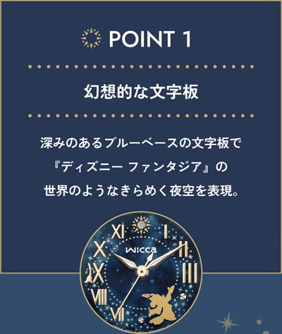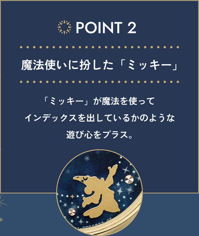 ・5時の位置に魔法使いに扮した「ミッキー」のシルエットを描き、「ミッキー」が魔法を使ってインデックスを出しているかのような遊び心をプラス。