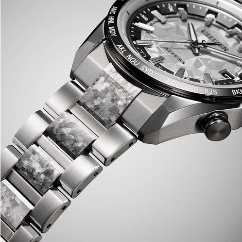 ・シチズン独自の技術で開発した結晶チタニウムを中駒に採用。デュラテクトプラチナを重ねることで結晶模様がプラチナの輝きをまとい、存在感を放ちます。