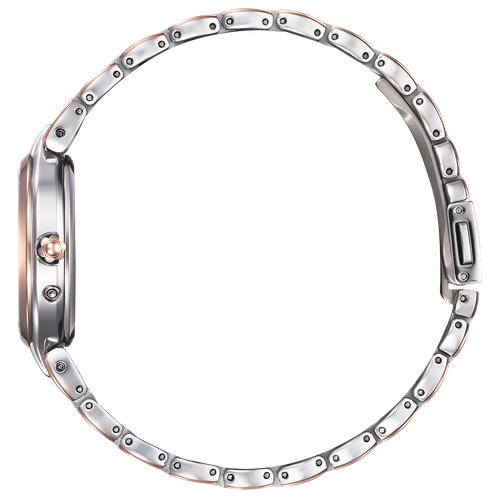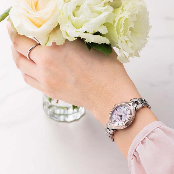 ・お花をモチーフにしたバンドのデザインが人気のシリーズ。バンドから繋がるようなケースラインがエレガントな印象を演出します。