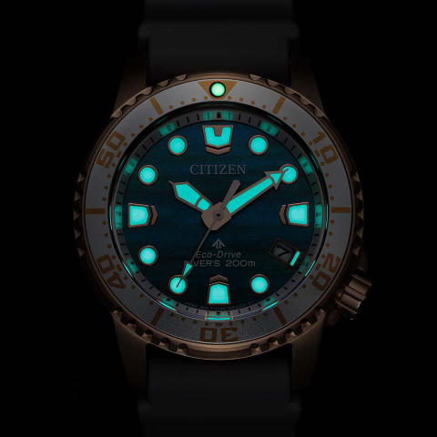 Go Deeper。どれだけ潜っても届かない、深い海の底へ。本格仕様のダイバーズウオッチ、プロマスター「MARINEシリーズ」に、清涼感あふれる特別なカラーリングの限定モデルが登場。文字板には、見る角度によって青緑から青紫へと変化する構造色フィルムを採用。水深によって色が変化する、美しく澄んだ海を表現しています。