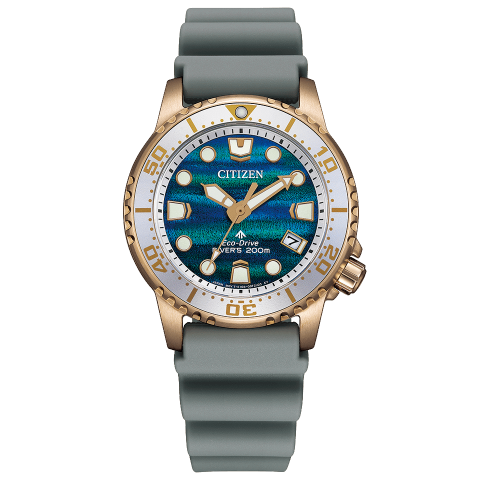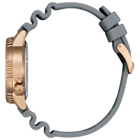 淡いウォームゴールドのケースにグレーのバンドをコーディネートしました。200m潜水用防水など、ダイビング中の安全性を考慮した本格派のスペックを搭載。ウレタンバンドの素材には劣化しにくい樹脂素材「BENEBiOL™」を採用し、長くご愛用いただける品質にこだわりました。