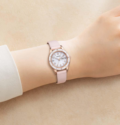 フェミニンなピンクゴールドケース×ピンクベージュバンドが、腕元を華やかに彩ります。