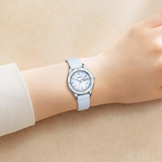 爽やかなシルバーケース×ライトブルーバンド×オーロラカラーインデックスが、腕元を華やかに彩ります。